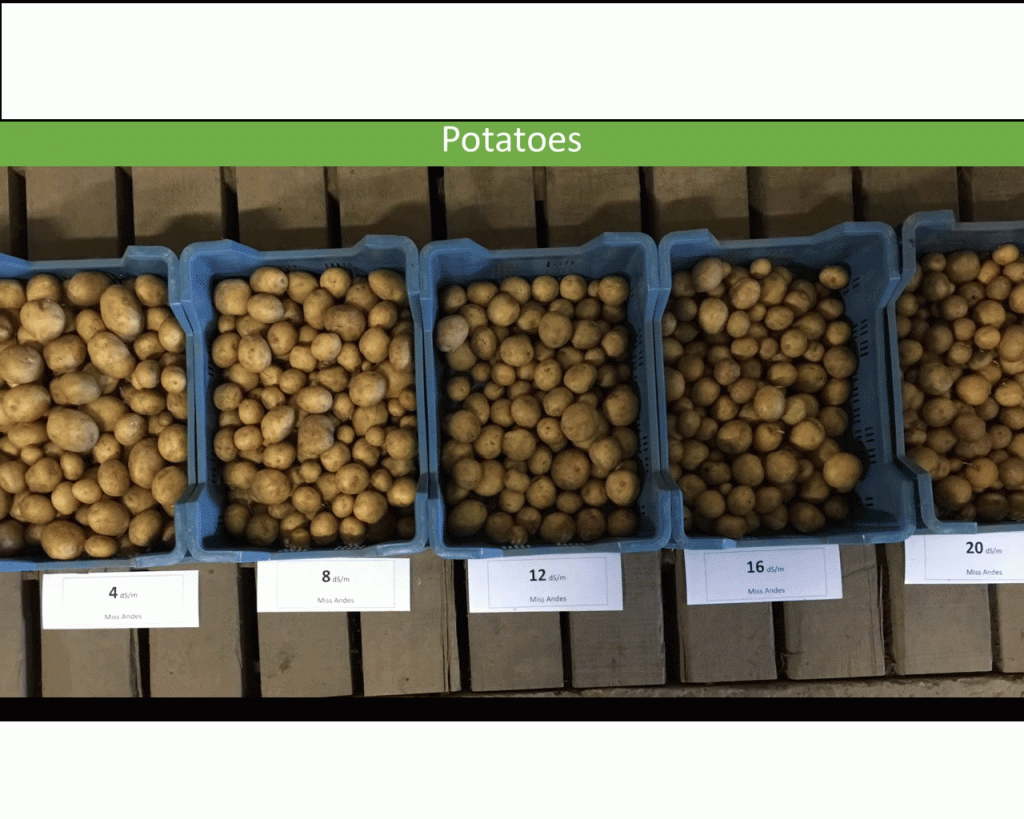 Brojevi (4, 8, 12, 16 i 20) ispod sanduka krumpira su u dS/m. Krajnja vrijednost slanosti pri kojoj je uzgojen zadovoljavajući krumpir je preko 10 puta veća od one deklarirane u priručniku FAO-a. Toliko o autoritetima i njihovom zastarjelom znanju. Naravno prinosi pri povećanom salinitetu su manji od uobičajenih 60 tona po hektaru (u Nizozemskoj), ali opet znatno veći od onih koji se trenutno mogu dobiti na zaslanjenim površinama Pakistana, Kenije i drugih zemalja.