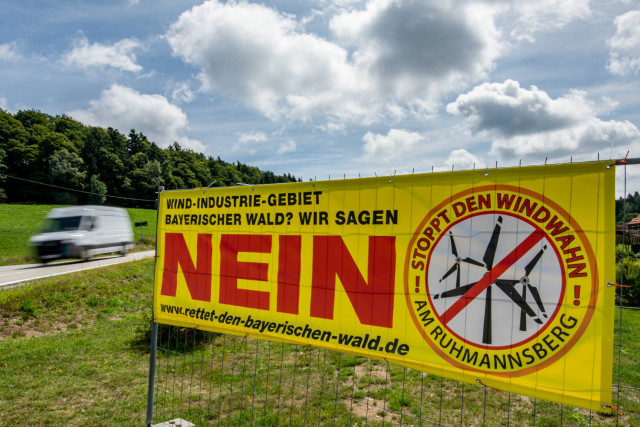 Na slici je protestni pano iz Bavarske postavljen zbog predviđene sječe šume radi postavljanja vjetroelektrane. Postoji i jedan društveni problem u cijeloj priči. Naime, vjetroturbine se postavljaju izvan velikih gradova tako da milijuni građana mogu mirno spavati znajući da za njih radi „zelena“ energija. To nije slučaj s njihovim sudržavljanima koji žive u manjim mjestima, odn. selima. Osim što mogu uzrokovati tjeskobu stanovnicima, nisu pogodne za razvoj seoskog turizma i nagrđuju nedirnutu prirodu. Noću se ljudi osjećaju kao da žive pokraj aerodroma. Angela Merkel svojim zadnjim planom predviđa sudjelovanje lokalnih zajednica u dijeljenju profita od vjetroelektrana (čitaj: potkupljivanje).