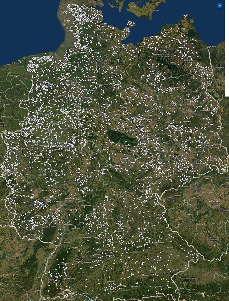 Nemam ništa protiv slobode riba (a koji put ni u tanjuru), ali ne razumiijem tako veliku ravnodušnost prema pticama. Malo sam pristran jer su mi ptice ljepše od riba, a i predstavljaju simbol slobode (slobodan kao ptica). Bojim se da ta uzrečica neće dugo vrijediti. Na sljedećoj slici su položaji vjetroturbina u Njemačkoj 2015.g.