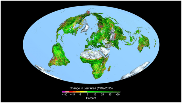 se vide promjene u zazelenjenosti (valjda se tako kaže) površina od 1982. do 2015.g. iz satelitskih podataka. Zeleno je porast, crveno pad, a bijelo bez promjene. Najveća područja bez promjene su Sahara, Arapski poluotok, Grenland i Antarktika. Sahara i A. poluotok zato što nema kiše, a Grenland i Antarktika zato što su zaleđeni. Razlika u korist zelenog je 17.5 mil. km2. Preko dvije trećine ovog zelenog (70%) je posljedica porasta CO2 u zraku, odn. u protekle 33 godine smo dobili jednu cijelu zelenu Europu (po površini).