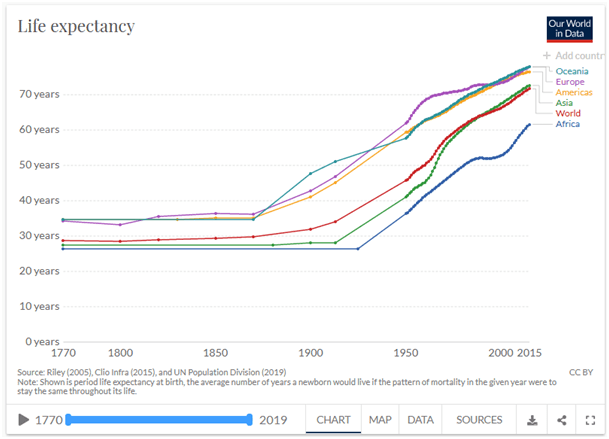 Do industrijske revolucije životni vijek je bio 30 do 35 godina. I odonda raste do današnjih preko 70. Afrika i Azija, zbog nerazvijenosti, kasne.