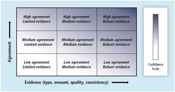 „Pouzdanost u ispravnost saznanja, temeljena na vrsti, količini, kvaliteti i dosljednosti dokaza (npr. mehanističko razumijevanje, teorija, podaci, modeli, stručna procjena) i stupnju suglasnosti. Pouzdanost se izražava kvalitativno.