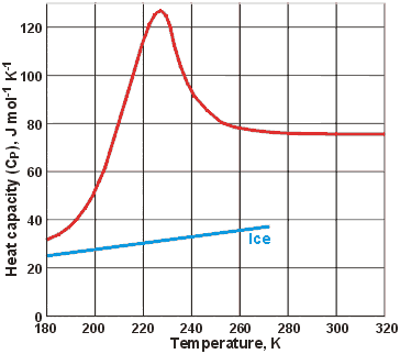 Na internet stranici Sveučilišta London South Bank ima i o drugim anomalijama vode. Kad se sve zbroji – 74 anomalije (zasad). Stalno se pronalaze nove i ne mislim da će taj proces uskoro prestati. Ovdje samo jedan primjer. Specifični toplinski kapacitet ima maksimum na oko -45 oC, a radi se o duboko-pothlađenoj vodi. Na sljedećoj slici se vidi izraziti skok kod 230 K (Kelvina).