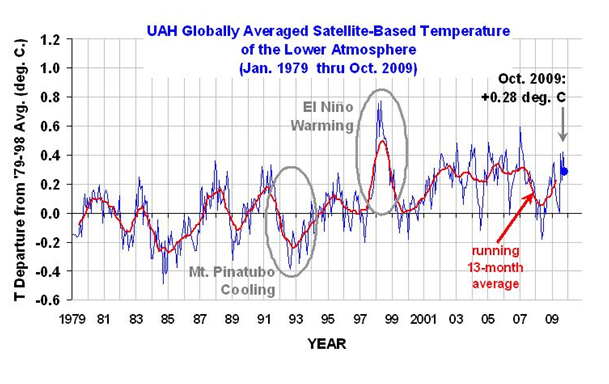 Na gornjoj slici vide se efekti dva prirodna događaja na srednju globalnu temperaturu. Prvi se odnosi na erupciju vulkana 1991.g. nakon koje se temperatura spustila za 2 desetinke stupnja, a drugi je povišenje temperature za skoro pola stupnja za vrijeme jakog El Niña 1997-98. g.
