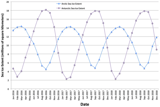 Iako ima grafikona koji pokazuju samo smanjivanje arktičkog leda odabrao sam onaj iz kojeg se vidi i da površina antarktičkog raste. Dakle, kako sezonski, tako i višegodišnji su ledene površine juga i sjevera u nekoj vrsti ravnoteže.