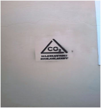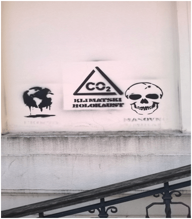 Sad je već puno jasnije o čemu se radi. Budući da se ne vidi dobro, ispod lijeve slike Zemlje koja se otapa piše ekocid, a ispod mrtvačke lubanje piše masovno izumiranje. Žestoke riječi: ekocid, holokaust , izumiranje.