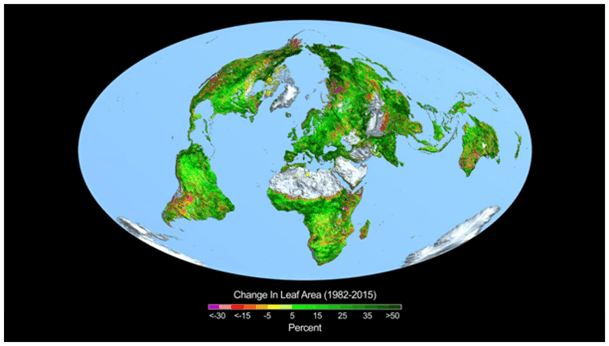 Vidite ovo silno zelenilo? Preko dvije trećine povećane zazelenjenosti planeta dugujemo povećanoj koncentraciji CO2 u zraku, jer je biljkama neophodan za život. Što ga više ima, to biljke više i brže rastu i još pritom efikasnije koriste vodu. Ugljikov dioksid je neophodan uvjet za život i, što ga više ima, to ima više života. Dok god bude dovoljno CO2 u zraku ne trebamo se bojati „smrti neviđenih razmjera i socijalnog kolapsa“. Upravo suprotno, ako ikad CO2 vrijednost padne ispod 150 ppm, ni životinje ni mi nećemo imati što jesti.