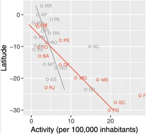 Stručnjaci iz brazilskog Zavoda za javno zdravstvo su istraživali povezanost geografske širine i pojave gripe i dobili sljedeći grafikon.