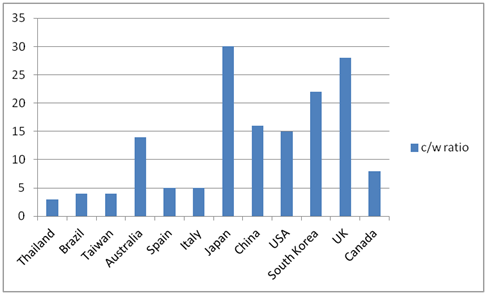 Somehow, the results from Gasparrini et al. (2) are being neglected. The authors investigated over 74 million deaths in the period between 1985 and 2012, of which 7.71% were attributed to non-optimum temperatures. Only 11.1% were attributable to combined extreme cold and hot temperatures (0.86% of the total number). I rearranged the order of countries in the table, from hottest to coldest, and got the next graph.