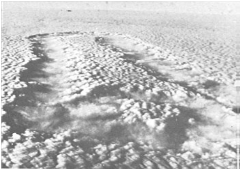 Zainteresirala se i vojska (a gdje je vojska tu je i novac) i evo slike jednog od prvih letova u kojima su se u oblak ubacivali peleti „suhog leda“. Nađen je prikladan oblak i 20 minuta kasnije par kila CO2 je napravilo pravilnu rupu u hladnom slojevitom oblaku. Bila bi još pravilnija da uređaj za izbacivanje nije radio i kad nije trebao, a avion već bio u penjanju da poslika efekte, pa otud ona mala petlja na donjoj polovici slike.