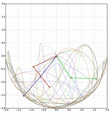 Uopće ne izgleda kaotično, a ipak se krivulja nigdje ne podudara i ne presijeca (nema ponavljanja odn. periodičnosti). U prirodi su događaji često „kaotični“. Jedan od najjednostavnijih primjera „kaotičnog“ sustava je dvokrako njihalo. Budući da je moj blog od najjeftinije vrste, ne mogu staviti animaciju pa ću se poslužiti slikama.