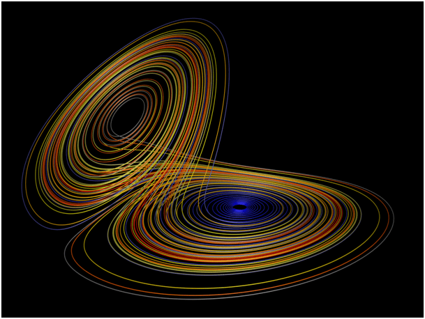 Drugim riječima, prognostički model će nam dati točnu buduću vrijednost (određenu sadašnjim trenutkom), ali samo ako savršeno znamo sadašnju vrijednost, sve mehanizme i veličine o kojima ovisi njena promjena. Ukoliko neki od uvjeta nije ispunjen, ne možemo računati na to da će model dati ni približno istinitu buduću vrijednost. Što idemo dalje u budućnost greška je sve veća. Kako bi sve bilo još malo kompliciranije, u determinističkom kaosu postoje i neki „čudni atraktori“. Nisam našao neki suvisli prevod, najbliže bi bilo „privlačitelji“, a radi se o grupi podataka (stanju u faznom prostoru) koji se asimptotski približavaju nekom drugom stanju u „bazenu privlačenja“. Nije da mi je matematički išta jasno, ali kad se prikaže slikom može se intuitivno odoka zaključiti da prostor nije jednoliko popunjen, kao kod nasumičnog gibanja i da su linije vrlo blizu (tako blizu, a tako daleko).
