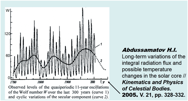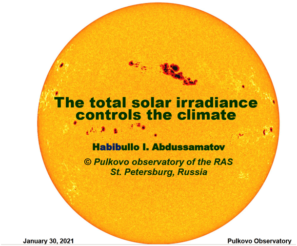 Dr. Abdussamatov, voditelj odjela opservatorija Pulkovo Ruske akademije znanosti iz St. Petersburga je autor prezentacije pod naslovom: „Ukupno Sunčevo zračenje upravlja klimom“. Ovdje je prikazujem u ponešto skraćenoj verziji, a moj osvrt i pojednostavljeno objašnjenje ključnih stavova u sljedećem postu.