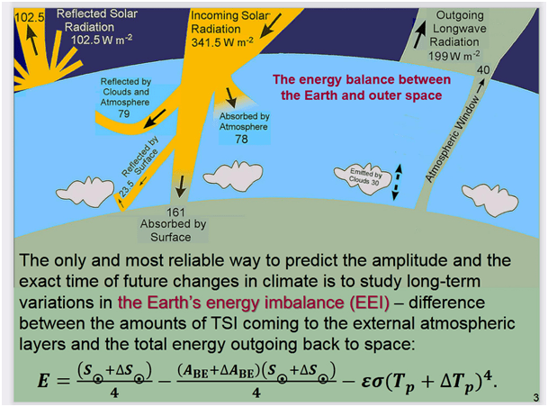 Klimatski sistem ovisi o vrlo složenom nizu dugotrajnih (duljih od 30 godina) fizikalnih procesa u ocean-kopno-atmosfera sustavu na koji, zauzvrat, stalno utječe ukupno sunčevo zračenje (TSI-total solar irradiance) u kvazi-dvostoljetnim varijacijama. Takve TSI promjene od 0.4 do 0.5% su beznačajne u zvjezdanom svijetu, ali mogu drastično promijeniti Zemljinu klimu. Značajne klimatske promjene su potpuno prirodan proces i čovječanstvo nema praktički nikakve veze s njima.