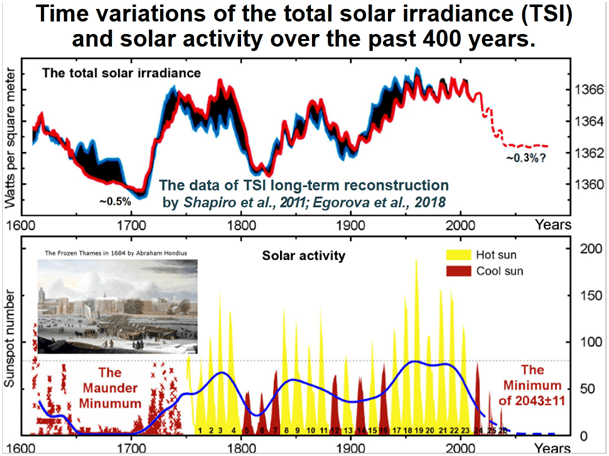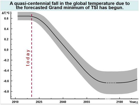 Sunce je ušlo u dulje hladnije razdoblje. U 21. stoljeću ćemo proživljavati razdoblje neuobičajeno slabih sunčevih ciklusa. Posljednji put kad je postojalo razdoblje duljeg sunčevog minimuma zvalo se Maunderov minimum, razdoblje od sedamdeset godina vrlo hladnog vremena (od 1645. do 1715. godine) koje se dogodilo za vrijeme jakog minimuma sunčevog zračenja. U drugoj polovici 21. stoljeća globalna temperatura će se spustiti za 1.3 oC, što će dovesti do nedostatka hrane i energije u tom razdoblju. Vlade država se trebaju pripremiti za ovaj scenarij, pripremiti planove i izvore za prilagodbu ekonomije novim uvjetima. Posljedice jakog zahlađenja iz razdoblja Maunder minimuma upozoravaju nas na potrebu da se osigura sigurnost čovječanstva u nadolazećim složenim vremenima.