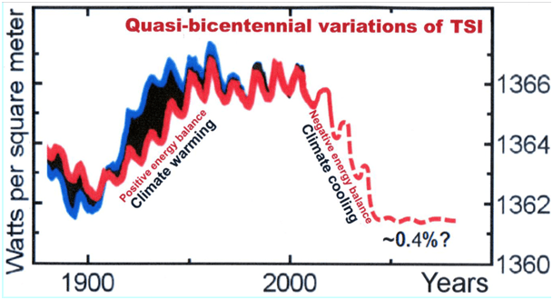 Globalno zagrijavanje zadnjeg dijela 20. stoljeća je prouzročeno dugotrajnim promjenama emitiranog Sunčevog zračenja kroz skoro cijelo stoljeće i odgovorno je za praktički sve klimatske promjene planeta Sunčevog sustava. Zagrijavanje koje je zabilježeno na Marsu i drugim planetima može se pripisati “sunčevom ljetu” i izmjenama kvazi-dvostoljetnih klimatskih uvjeta kroz cijeli sunčev sistem. Nakon maksimuma 24. sunčevog ciklusa 2016. godine “sunčevo ljeto” je završilo i započela je “sunčeva jesen” nakon koje se 2070. ±11 godine očekuje “sunčeva zima”. “Sunčevo proljeće” će nastati tek početkom 22. stoljeća. Sve promjene Zemljine klime, od Malog do Velikog ledenog doba će doći i proći, kao i uvijek, bez naše pomoći ili dozvole. Sve ove promjene su posljedica cikličkih varijacija TSI, uzimajući u obzir ne samo izravne nego, još značajnije, posljedične sekundarne povratne efekte. Postupno slabljenje Golfske struje će prouzročiti jače zahlađenje u njenoj zoni utjecaja: zapadnoj Europi i istočnim dijelovima SAD-a i Kanade.