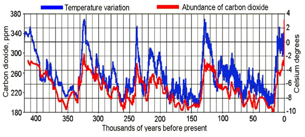 – značajna periodička povećanja atmosferskog CO2 u proteklih 800 000 godina su uvijek bila posljedica porasta temperature s kašnjenjem od 800±400 godina