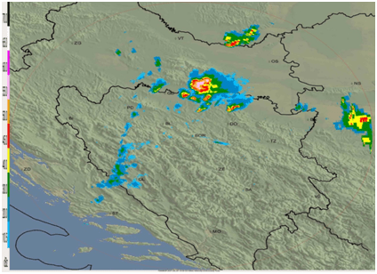 Nas zanimaju dvije crveno-plave mrlje u sredini slike, odnosno oblačna masa koja se približava Savi s juga. Pola sata kasnije situacija je izgledala ovako.