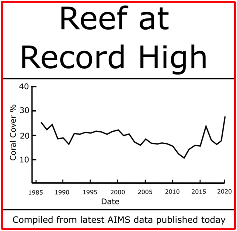 Ridd se sjeća početaka mjerenja stanja grebena i kaže kako se u vremenu nije značajno mijenjala njegova veličina ni ugroženost, ali je zato broj znanstvenika i menađera koji se njime bave otišao u nebo, u čemu je vjerojatno i problem. Ovakve izvještaje ipak skoro nitko ne objavljuje, a alarmistički „stručnjaci“ ponovno upozoravaju da je oporavak koralja „privremen“. Naravno da je privremen. Površina koraljnog grebena se stalno mijenja (kao što se vidi iz grafikona), a kad jednom dođete na vrh – svi putevi vode prema dolje. Nitko ne zna kad, ali sasvim je sigurno da će ponovno biti uspona i padova, što vrijedi za sve forme života.
