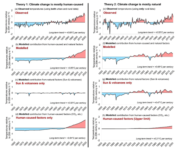 Istraživanje je pokazalo da znanstvenici dolaze do oprečnih zaključaka o uzroku nedavnih klimatskih promjena u ovisnosti o podacima koje koriste. Na primjer, na grafikonima dolje, lijeva strana dovodi do zaključka da su promjene globalne temperature od sredine 19. stoljeća najvećim dijelom uzrokovane čovjekovim emisijama, posebno ugljikovog dioksida, tj. zaključka do kojeg je došao IPCC. Za razliku od toga, grafikoni na desnoj strani vode do potpuno suprotnog zaključka, tj. da su promjene globalne temperature od sredine 19. stoljeća najvećim dijelom posljedica prirodnih ciklusa, uglavnom dugoročnih promjena energije koju emitira Sunce. Obje strane grafikona su zasnovane na objavljenim znanstvenim podacima, ali svaka strana je posljedica upotrebe različitih podataka i pretpostavki. Na lijevoj strani pretpostavljeno je da na zabilježene temperature nije djelovao problem urbanog „toplog otoka“ tako da su upotrijebljeni podaci svih dostupnih mjernih stanica, kako urbanih tako i ruralnih. Na desnoj strani su upotrijebljene samo ruralne stanice (postavljene izvan gradova, op.prev.). Na lijevoj strani je jačina sunčevog zračenja modelirana upotrebom podataka male promjenjivosti (ukupnog sunčevog zračenja, op.prev.) koju je IPCC odabrao za svoje šesto Izvješće (objavljeno prije nekoliko dana, op. prev.). Ono podrazumijeva nepostojanje prirodnog doprinosa prirodnih faktora dugoročnom zatopljenju. Na desnoj strani jačina sunčevog zračenja je modelirana upotrebom podataka velike promjenjivosti koju koristi grupa zadužena za NASA-ine ACRIM satelitska mjerenja Sunčeve aktivnosti. Ovo ukazuje da je veliki dio, ako ne i cjelokupna vrijednost, dugoročnih temperaturnih promjena uzrokovana prirodnim faktorima.