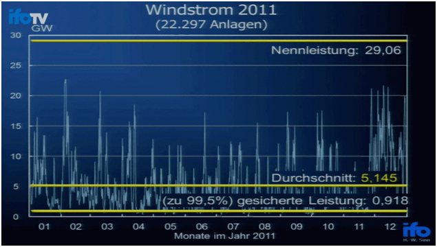 Struja dobijena od 22 297 vjetroturbina 2011.g. u Njemačkoj. Dolje mjeseci, lijevo dobijena struja. Nazivna snaga 29.06 , srednja 5.145, 99.5% vjerojatna 0.918 GW