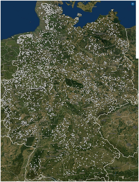 Gdje stane tih trideset puta više od postojeće mreže, teško je reći. Dolje je prikaz lokacija vjetroturbina u Njemačkoj 2015.g.. Predlažem da se turbine postave po gradovima. To bi bio najbrži način da se riješimo ovih beskorisnih i ubojitih monstruma (ovdje), jer bi konačno i gradsko (većinsko) stanovništvo shvatilo da se uz njih ne može živjeti, a struje ionako daju malo i na prekide.