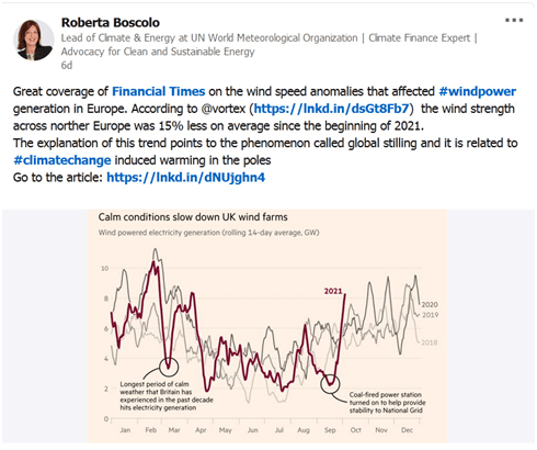 Šefica Svjetske meteorološke organizacije za klimu i energiju Roberta Boscolo je izjavila kako je vjetar puhao 15% manje prvoj polovici 2021. (tako kaže jedno istraživanje) na području Sjeverne Europe, što je posljedica klimatskih promjena, zbog zagrijavanja polarnih područja. Nažalost, nisam mogao saznati što je po struci dotična gospođa, jer je na svom profesionalnom profilu napisala da je “stručnjak za klimatske financije”. Vratimo se njenom razmišljanju. Prvo, stalno nam se govori kako vjetar, zbog klimatskih promjena, puše više i jače, a ne manje. Drugo, kako to da se polarna područja zagrijavaju, a ledenog pokrova ima sve više na oba pola i uz to je Antarktika rekordno hladna.