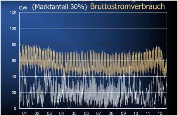 Donja bijela krivulja je proizvodnja energije (struje) od vjetroturbina i solarnih panela. Gornja žuta krivulja prikazuje potrošnju. Lijevo su GigaWati struje. Što su krivulje bliže jedna drugoj, to treba manje koristiti konvencionalne izvore i obratno. Obratite pažnju na položaje bijele krivulje koji su najniže, praktički na nuli. To su situacije kad vladaju tamne tišine, odnosno nema vjetra, a ni Sunca. Tada konvencionalni izvori moraju potpuno osigurati energiju. Obratni problem se događa kad se dvije krivulje preklapaju. U tom slučaju vjetar i solari daju više energije nego što je potrebno. Tako je 2019. godine Njemačka 308 sati imala negativnu cijenu struje. U prevodu to znači da su plaćali drugim državama da preuzmu višak. Skokovitost bijele krivulje pokazuje i nestalnost proizvodnje, što opet znači da u rezervi uvijek treba imati neki pouzdani konvencionalni izvor. Tako sustav može funkcionirati samo ako je dvostruko pokriven, a to znači i plaćen (ljudi, održavanje pogona i sl.).
