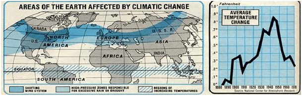 Vratimo se malo u povijest. Tjednik Newsweek je 1975. objavio članak s naslovom „Svijet koji se hladi“. Kao što se vidi na grafikonu (desno dio slike), globalna temperatura je rasla do sredine četrdesetih godina 20. stoljeća, a onda je krenula nizbrdo i to tridesetak godina. Dovoljno da izazove zabrinutost kod znanstvenika i pretpostavku o nadolazećem ledenom dobu. Na lijevom dijelu slike su prikazane područja u kojima se očekivala promjena sustava vjetra, oborine i temperature.