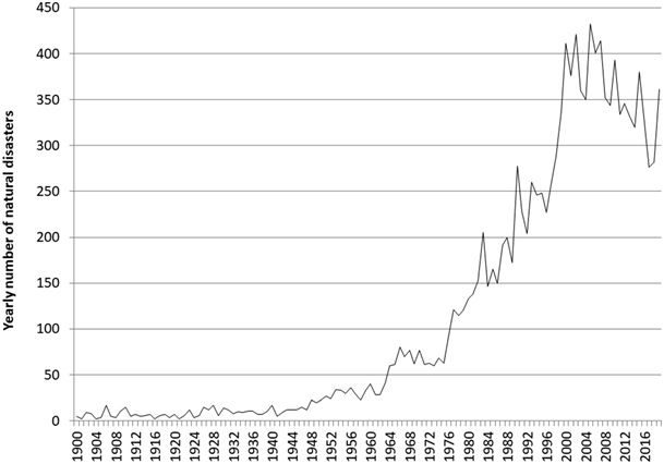 Bez obzira što porast djeluje sugestivno, ovdje se radi o poboljšanju registracije događaja, a ne o prirodnom trendu. Riječima CRED-a: „S gledišta analize prirodnih katastrofa, rast stanovništva i obrasci ekonomskog razvoja su važniji od klimatskih promjena ili cikličke varijacije vremena kad se objašnjava ovaj uzlazni trend. Danas, ne samo da je više ljudi u opasnosti nego prije pedeset godina, nego je i gradnja u poplavnim ravnicama, zonama potresa i drugim visoko rizičnim područjima povećala vjerojatnost da uobičajena prirodna opasnost postane velika katastrofa.“