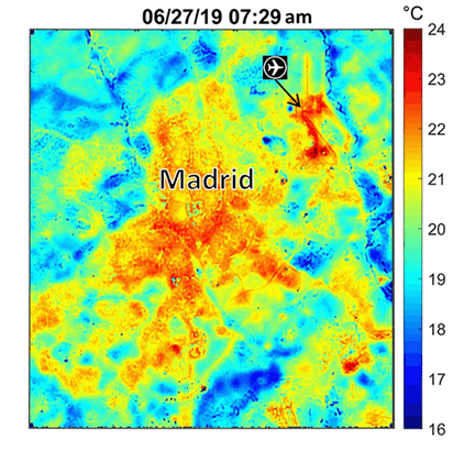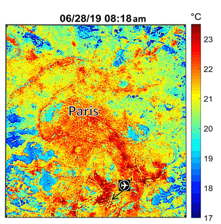 Na svim slikama je označen položaj aerodroma, a skala boja označava temperature. Radilo se o jutarnjim temperaturama jednog toplinskog vala. Gradski beton i asfalt su akumulirali toplinu tako da nije ni došlo do noćnog ohlađivanja. U suvremeno vrijeme treba dodati i mnogobrojne klima uređaje (koji naravno hlade unutrašnjost stana, ali toplinu predaju okolnom vanjskom zraku). Temperaturna razlika na svim slikama iznosi četiri do pet stupnjeva.