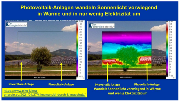 Druga posljedica je principijelne naravi. Odmak od fosilnih goriva se radi pod izgovorom da ugljikov dioksid pretjerano grije atmosferu. Pokazalo se da i solari i vjetroturbine griju atmosferu. Solarni paneli su crni i mali dio sunčeve energije pretvaraju u struju, a najveći dio u toplinu. Nije neuobičajeno da paneli imaju i do 30 oC višu temperaturu od okolnog zraka.