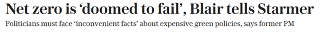 Prevedeno: „Neto nula (emisija) je osuđeno na neuspjeh, kaže Blair Starmeru. Političari se moraju suočiti s „neugodnim činjenicama“ oko skupih zelenih politika, kaže bivši britanski premijer.“