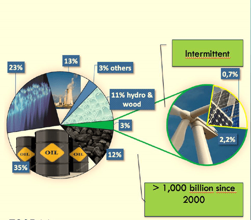 Bez obzira na takvo stanje stvari DI i dalje predlaže još agresivniju zelenu tranziciju. Furfari (2024) naglašava postojeće probleme nepouzdanosti energije vjetra i sunca, skupe infrastrukture pohrane (dodao bih i opasne), stalne potrebe financijskog potpomaganja unatoč desetljećima investiranja, što sve ima za posljedicu povećanu cijenu struje. Uz to, najveći dio ove infrastrukture proizvodi se u Kini (85% solarnih panela, npr.) U izvještaju se vrlo malo spominje nuklearna tehnologija, a nafta samo jednom. U stvarnosti energija se dobija iz sljedećih izvora.