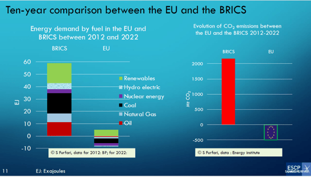 Za one koji nisu vični grafikonima kratko objašnjenje. Države BRICS-a razvijaju i troše sve energetske izvore, ali je glavnina oslonjena na fosilna goriva (ugljen, naftu i plin), dok EU razvija obnovljive, ali zato značajno smanjuje upotrebu fosilnih goriva. Na desnoj strani se vidi posljedica takvih politika, odnosno porast emisija u BRICS-u i pad emisija u EU. Drugim riječima, veliki dio stanovništva Zemlje „ne zarezuje ni 2 posto“ (ferma, šljivi i sl.) pokušaje EU da s „visoko moralnog pijedestala“ utječe na sporiji razvoj ostalih. Jedina posljedica ovakvog razvoja situacije je nazadovanje EU, jer dok svi drugi idu naprijed naši „moralni“ političari nas guraju u srednji vijek. Ako želimo stvarno sačuvati prirodu moramo koristiti fosilna goriva ili nuklearne elektrane. Čim se političko-birokratski diktat umiješa u tehnologiju, stvar je osuđena na propast.