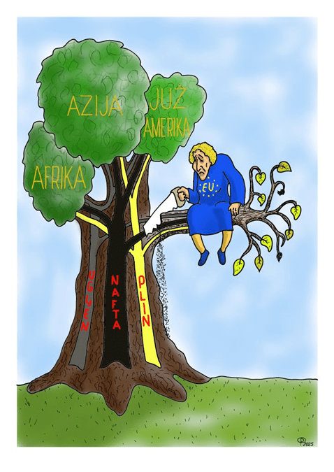 Postoje značajnije teme. Ajmo malo o geografiji. Najveća država po površini i broju stanovnika u Europi je Rusija. Zanimljivo. Izgleda kao da posljednjih godina, barem prema javnosti kolektivnog zapada, ona uopće ne pripada Europi. Možda se uskoro pojave i novi udžbenici zemljopisa koji će ovaj naš kontinent dodatno smanjiti. I s Rusijom smo skoro najmanji, a bez nje smo značajno manji i od Australije. Proteklih nekoliko godina naša stara, arogantna i gangrenozna Europa se uporno pravi da Rusija ne postoji. I eto, bojim se da je Rusija shvatila poruku i odustala od nas. Iskreno, s punim pravom. Ono što je začuđujuće sljepilo mnogih je iluzija o našoj vlastitoj važnosti. Kao, ove silne sankcije će je slomiti i onda će nastati raj za komadanje najveće zemlje s neprocjenjivim bogatstvima koja samo čekaju da ih opljačkamo. Bumerang je čudna naprava. Pošalješ ga daleko, ali ako promašiš, pazi prste i glavu. Svejedno, iako smo vazali vazala, tj. sluge EU koja je sluga SAD-a i dalje se pravimo da nam je dobro. Užitak je plaćati tri puta više za plin, naftu i ostale važne sirovine. Evo jedne prigodne Olegove karikature.