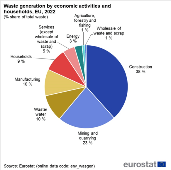 Primjetno je da građevinarstvo i rudarstvo doprinosa zajedno preko 60% ukupnog otpada, otpadne vode 10%, jednako kao i industrijska proizvodnja, dok poljoprivreda zajedno sa šumarstvom i ribarstvom čini samo 1% ukupnog otpada. Posljednjih godina poseban značaj se pridaje otpadu od kućanstava. Na razini EU količina tog otpada pridonosi manje od 10% ukupnog. Procjene za RH prikazuju različitu sliku. Tako naša kućanstva postotno proizvode dva i pol puta više od EU prosjeka, a poljoprivreda, šumarstvo i ribarstvo deset puta više (Slika 2.).